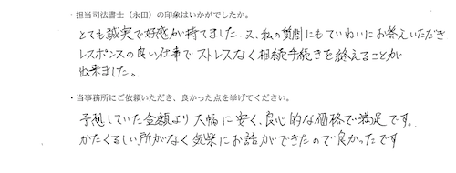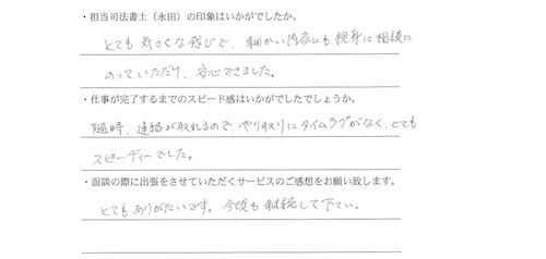 ご依頼者と随時連絡を取り、書類の取り寄せをできる限り迅速に行うことによって無事に相続登記を進め、